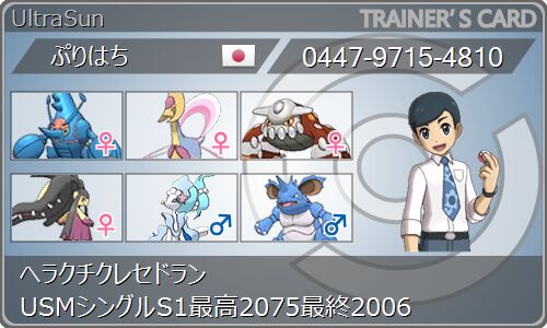どうも初めましてもしくはお久しぶりです。ぷりはちです。 USM最初のシーズンお疲れ様でした!今回はUSMシングルS7での使用構築の記事になります。 成績 最高レート 2075(111位) 最終レート 2006(546位) 以下、最高レート時の画像とPGL順位です。 1. 並…